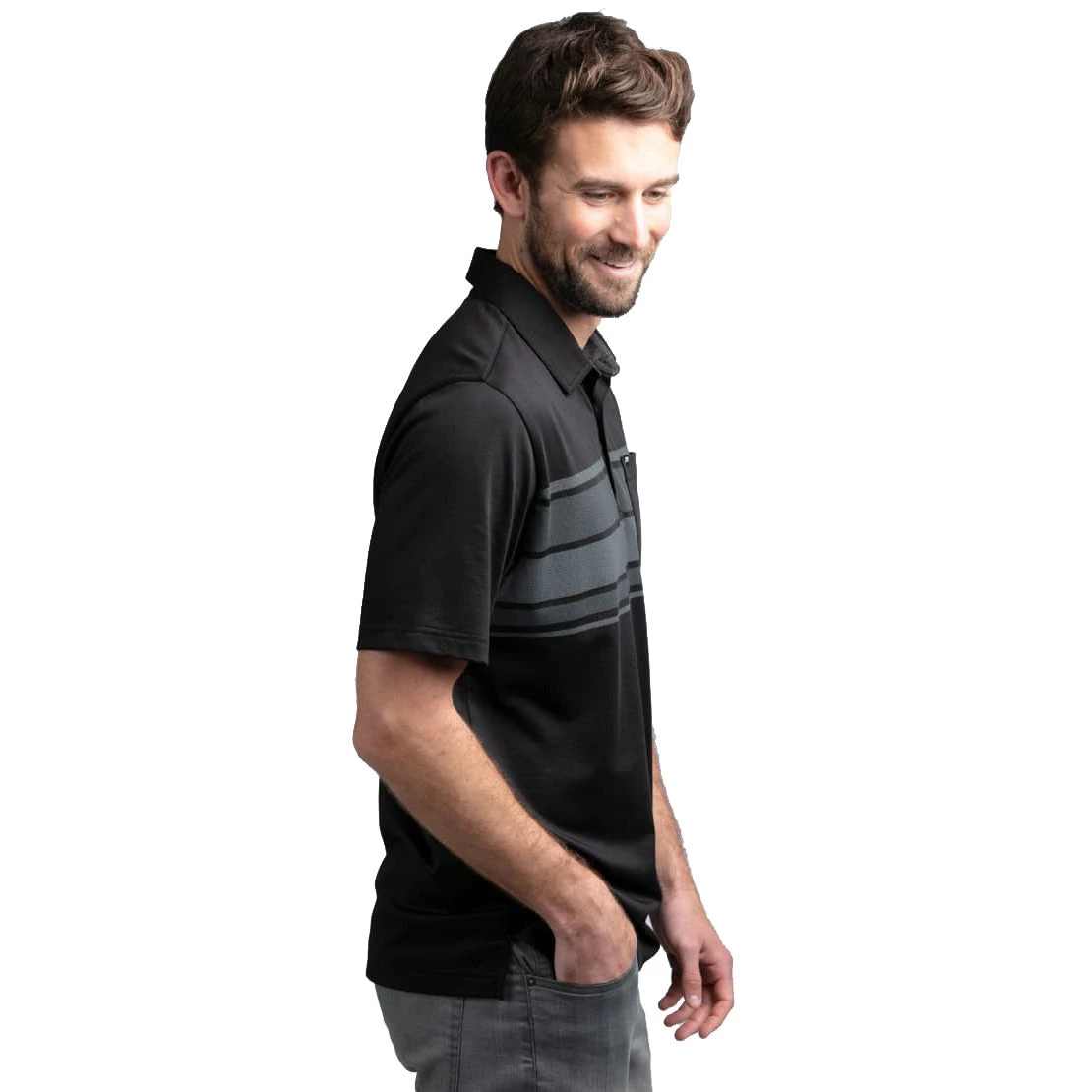 - Black polo with grey chest stripesEnhanced stretch and wrinkle-resistant