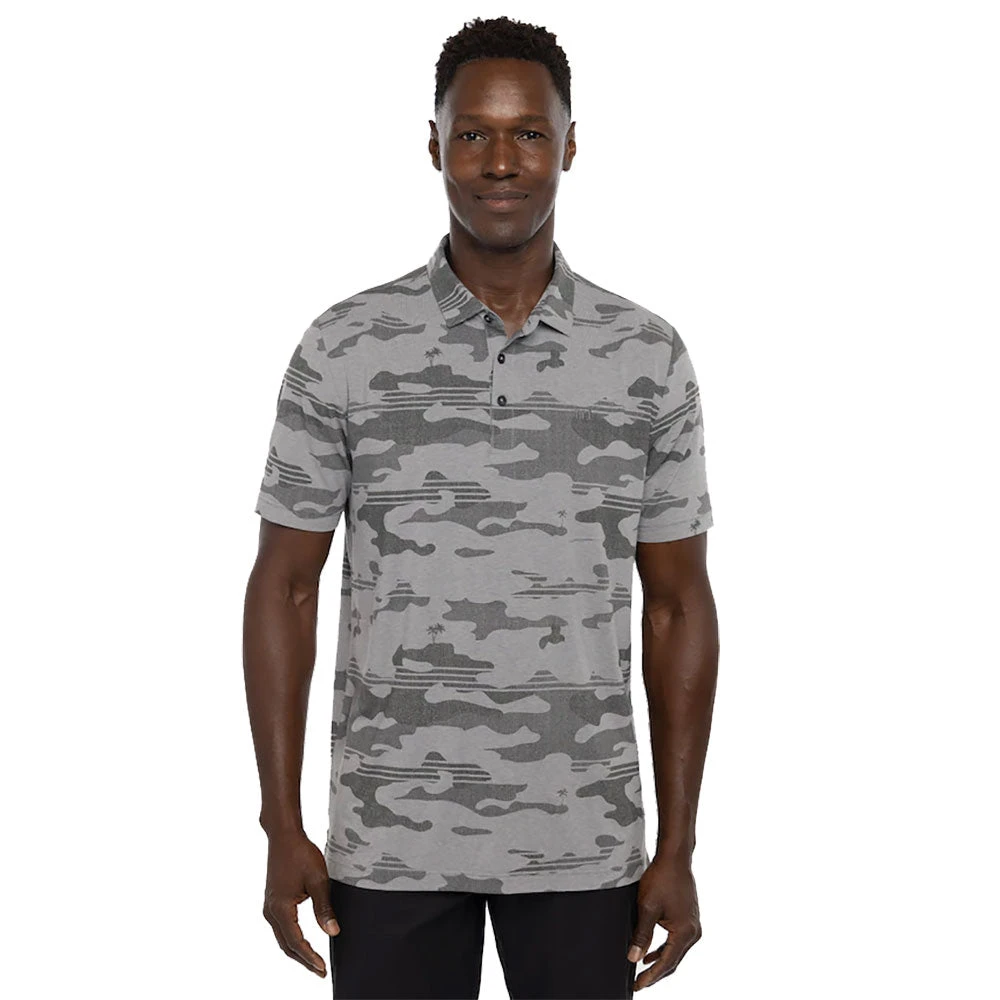 Take your golf style to the next level with the TravisMathew Heater Camo Mens Golf Polo. Designed with a linen-textured camo print and hidden palm trees, this polo will have you looking your best on and off the course. It features a built-in collar, custom corozo buttons for an elevated look, and a printed logo on the back yoke.